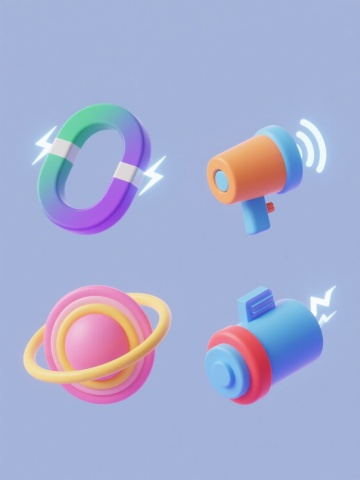 一套6张系列素材集合,每张素材均为规整排布的单一元素图案,保持简约现代的3D卡通风格,采用纯色背景,无任何文字、logo及水印。整体造型圆润可爱,具有光滑的塑料质感和柔和的光影效果,高光与阴影过渡自然,物体边缘有轻微的模糊处理以增强立体感。每张素材中改变喇叭的造型设计和颜色,喇叭主体为不同颜色的圆润扩音筒,搭配黄色的喇叭嘴和手柄,带有卡通化的眼睛和表情,以及黄色的声波线条从喇叭口向外扩散,保持统一的构图和视觉风格。