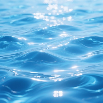 超写实3D渲染的蓝色水面,呈现出细腻的波浪纹理,阳光照射下波光粼粼,水面反射出明亮的高光和柔和的蓝色渐变,整体色调以纯净的蓝色为主,画面宁静而富有光泽感,营造出清澈透明的视觉效果,水面波浪形态自然流畅,具有高度逼真的材质质感和光影细节。