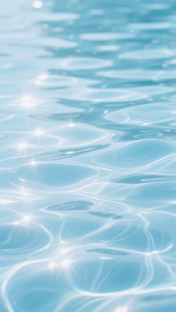 清澈透明的浅蓝色水面,阳光照射下呈现出柔和的波纹效果,水波纹理细腻且富有层次感,光影交错形成明亮的光斑和深邃的阴影,整体画面宁静而富有动态感,水波纹自然流畅,覆盖整个画面作为背景,色调统一为淡蓝色系,营造出清新、通透、凉爽的视觉氛围。