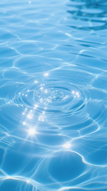 清澈透明的蓝色水面,阳光照射下形成密集且规则的环形波纹纹理,光线在水面折射出明亮的白色光斑和交错的光带,整体呈现出平静而富有光泽的写实质感,水波纹理呈同心圆状均匀扩散,色彩从深蓝到浅蓝渐变自然,光影层次分明,营造出宁静而清凉的夏日氛围。