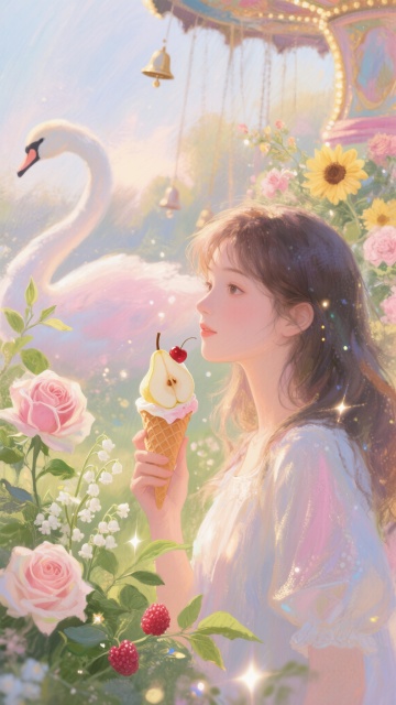 夜晚庭院,晚风轻拂,一位身着素雅衣衫的女子凭栏而立,眉宇间带着忧愁,耳边似有歌声萦绕,身旁摆放着旧相框等老物件,泪光在眼眶中闪烁;不远处,扎着双马尾的小女孩踮着脚尖,努力想逗女子开心,小脸憋得通红,伸出小手仿佛在施展爱的魔法,周围空气中浮现出红色爱心和温暖光晕,整体氛围从忧伤逐渐转为温馨治愈,画面充满情感张力