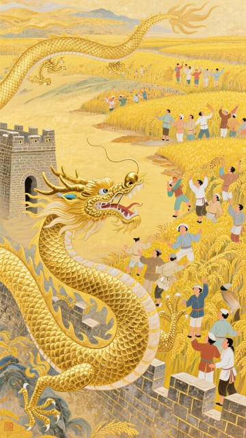 国潮风与工笔风交融,鎏金线条勾勒长城蜿蜒于彩霞山川间,重拟物与刺绣质感交织,呈现梦幻奢华的中式古典画卷。