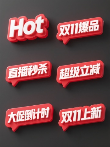 六个促销标签以两行三列规整排布,每个标签为单一纯色背景(橙色、绿色为主),标签形状为不规则几何图形或对话框样式,带有白色描边和轻微立体阴影。标签上方配有相关卡通图标:“好物秒杀”标签配黄色购物袋图标,“双11专场特惠”标签配蓝色日历和铅笔图标,“预热特惠”标签配书本和铅笔图标,“多重好礼”标签配彩色礼盒和星星图标。文字采用无衬线粗体,白色字体,部分关键词如“秒杀”“特惠”字号加大,整体风格活泼明快,具有电商促销的强烈视觉吸引力,信息传达直接高效,适合吸引消费者注意力。