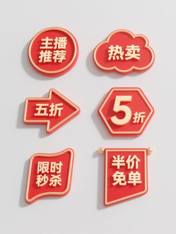 6个规整排布的促销标签素材,每个标签为单一内容的立体设计,采用红色与白色为主色调,具有强烈的3D立体效果和鲜明的色彩对比,标签文案分别为"Hot"、"双11爆品"、"直播秒杀"、"超级立减"、"大促倒计时"、"双11上新",每个标签均为纯色背景,整体呈现出促销活动的热烈氛围和醒目的视觉效果,字体选择粗壮有力的无衬线体,具有强烈的视觉冲击力和促销感。