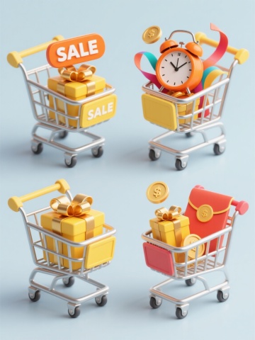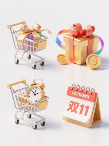 一组4个不同配色、不同样式、不同材质的双11电商促销元素,3D立体风格,干净简约设计,符合现实逻辑,每个元素包含金属质感购物车、多彩丝带礼盒、金色硬币、闹钟、日历(显示11.11)、飘带等促销元素,光影明亮柔和,高细节,适用于电商素材,白色背景
