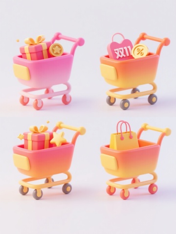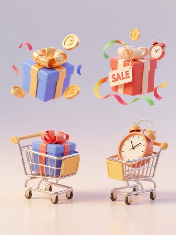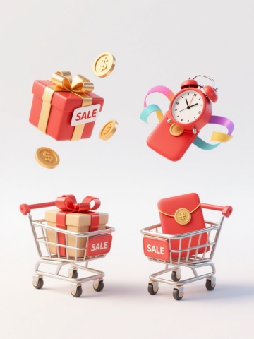 一套6张系列素材集合,每张均为规整排布的单一元素造型图案,保持简约现代风格,采用纯色背景。第一张:半透明渐变红色礼盒,顶部系着金色蝴蝶结,礼盒呈现轻微立体感,边缘有柔和高光和阴影,整体通透光滑;第二张:半透明渐变优惠券,带有虚线剪切边和折扣标识,保持与礼盒一致的光影质感和简约设计;第三张:半透明渐变喇叭造型,喇叭口朝右,线条流畅,体现现代简约风格;第四张:半透明渐变鼓掌手势,双手掌心相对呈鼓掌状,手指圆润,保持整体通透感;第五张:半透明渐变一堆金币,金币堆叠呈金字塔状,表面有光泽,体现金属质感;第六张:半透明渐变购物车,车筐为网格状,带有把手和轮子,造型简约现代,所有元素均保持统一的半透明渐变效果、光影处理和简约设计语言。