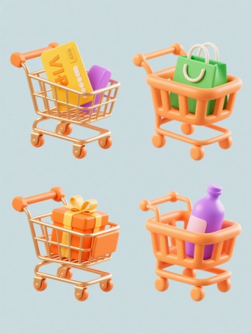 一套6张简约现代风格的系列素材集合,每张均为规整排布的单一元素图案,纯色背景。第一张:红包与金币组合,红包为传统样式,金色钱币环绕;第二张:柱状数据图与金币组合,橙色上升箭头,金色立体柱状图,底部圆形托盘,散落金币带高光;第三张:优惠券与金币组合,优惠券为矩形带撕边设计,金色钱币点缀;第四张:一堆金币,多枚金币堆叠,呈现金属光泽与立体感;第五张:购物车与金币组合,简约购物车造型,金币环绕四周;第六张:手机与金币组合,智能手机侧面造型,屏幕可显示简单界面,金币从屏幕溢出。所有元素均采用金色为主色调,搭配橙色点缀,3D立体效果,平滑渐变质感,高光处有闪亮特效,整体视觉统一,信息传达清晰。