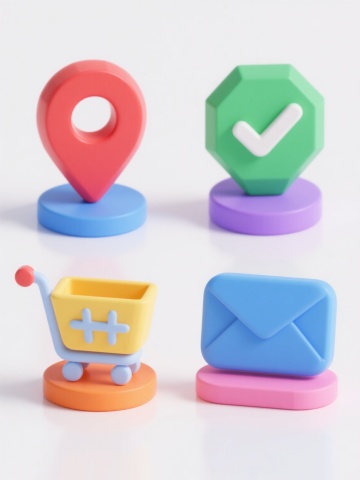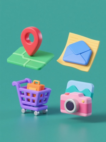 4个同风格系列图标规整排布,每个图标均采用3D立体简约设计风格,具有光滑渐变的材质、清晰硬朗的边缘轮廓和微妙的阴影立体感,背景为纯色且各自不同。第一个图标是红色定位标记插在绿色地图上,第二个图标是蓝色信封放在黄色纸张上,第三个图标是紫色购物车装载橙色商品,第四个图标是粉色相机对着青色风景,所有元素保持相同的3D建模风格、视觉重量和简洁造型,整体形成色彩丰富且风格统一的系列素材集合。