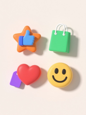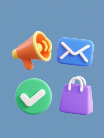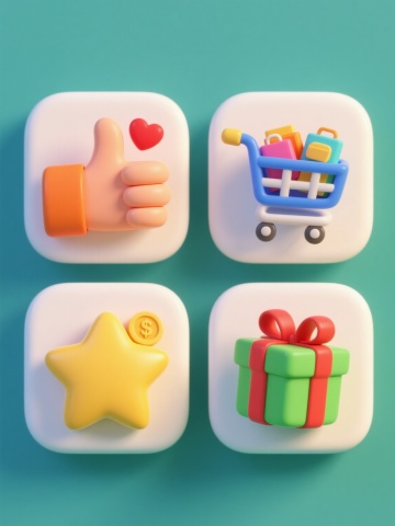六个不同颜色的购物相关图标组成的系列素材集合,每个图标都采用简约的3D立体风格,带有光滑的渐变表面和柔和的阴影效果,图标边缘圆润,整体呈现出一种现代、活泼的视觉感受,所有图标规整地排列在纯色背景上,保持一致的大小和间距,每个图标都有独特的颜色,分别为红色、蓝色、绿色、黄色、紫色和橙色,每个图标都代表不同的购物元素,包括购物袋、信用卡、礼物盒、优惠券、价格标签和商品货架