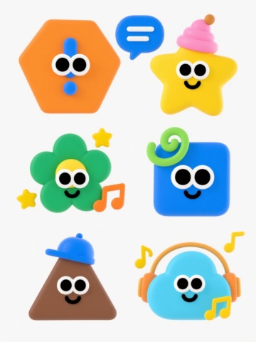 六个不同配色、不同样式的卡通素材,白色背景,排列整齐。每个卡通形象都有大大的黑色圆形眼睛和微笑的嘴巴,造型可爱。第一个是橙色的八边形,头上有一个蓝色的感叹号气泡;第二个是黄色的五角星,戴着粉色的冰淇淋帽子;第三个是绿色的花朵,旁边有黄色的星星和橙色的音符;第四个是蓝色的方形,头上有绿色的螺旋装饰;第五个是棕色的三角形,戴着蓝色的帽子;第六个是青色的云朵,戴着耳机,旁边有黄色的音符。每个卡通形象都有独特的颜色和装饰,整体风格统一,色彩鲜艳,充满童趣。
