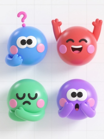 3D风格,6个不同配色、不同样式、不同材质的卡通风格3D元素,保持圆润可爱的造型特征,具有光滑的塑料质感和明亮的色彩表现,每个元素拥有独特的表情和姿态,整体排列整齐,置于纯白色背景上,光线均匀柔和,无明显阴影,突出物体的立体感和色彩鲜艳度,充满童趣和活泼氛围。