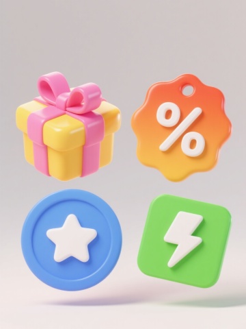 6个不同配色、不同样式的促销主题元素,采用圆润可爱的3D立体风格,每个元素具有光滑的渐变表面和柔和的高光,包含红包、金币、礼物盒等促销相关元素,元素间有细微的动态感,白色背景,所有元素排列整齐,形成和谐的视觉节奏,整体氛围喜庆活泼,色彩鲜艳明快,细节丰富,质感细腻,符合促销活动的视觉吸引力要求。