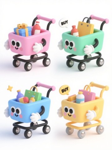 六个排列整齐的购物车主题3D立体插画,每个购物车外观、色彩和装饰元素各不相同,保持统一的低多边形Q版风格,圆润边角,高饱和度配色,柔和光影,轻微磨砂质感,白色背景。第一个黄色购物车装满彩色礼物盒、星星和金币;第二个粉色购物车带有蝴蝶结装饰,内有蛋糕和糖果;第三个蓝色购物车有波浪形边框,装满海洋元素和贝壳;第四个绿色购物车点缀树叶藤蔓,内有水果和蔬菜;第五个紫色购物车带有魔法元素,装满水晶球和星星棒;第六个橙色购物车有条纹图案,内有玩具和气球,每个购物车周围都有漂浮的主题相关小元素,整体构图平衡,充满童趣和节日氛围。