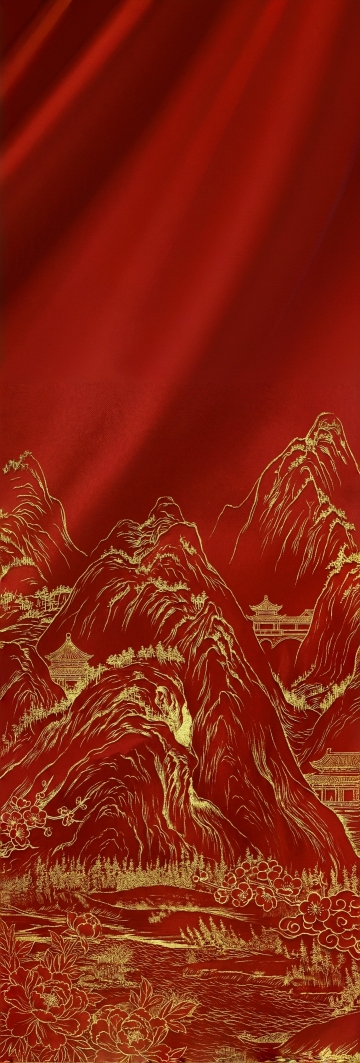 国潮风插画,鎏金浮雕质感,红金主调彰显中式奢华与喜庆,古典宫殿与山水相映,梦幻刺绣纹理点缀,尽显节日祥瑞之气。