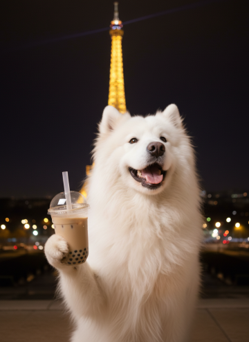 不经意间拍摄的,自然的光线,主角是图片中的这只猫,晚上,在巴黎卢浮宫前,抬起一只爪子拿着手抓饼。生成的图片中的猫尽可能和原图中的猫保持一致,这只猫咪可以表现的开心些。