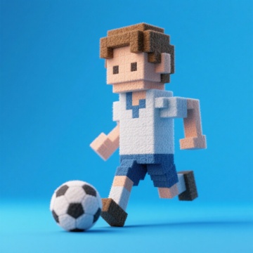 像素风3D卡通男孩踢球,软体体积感十足,萌趣可爱,蓝色背景突出活力氛围。