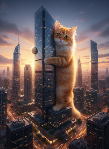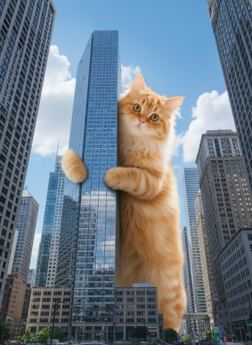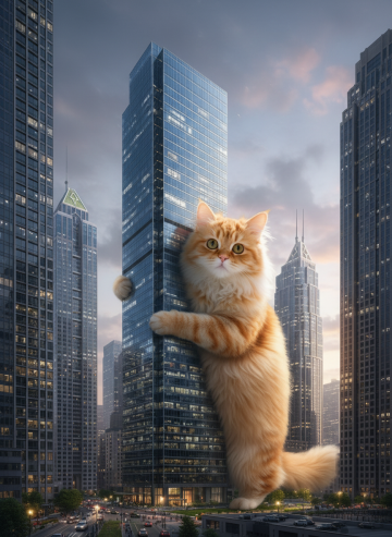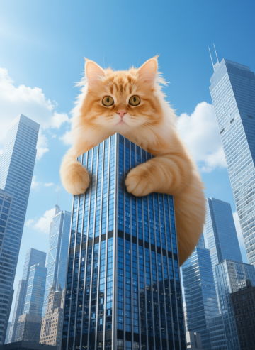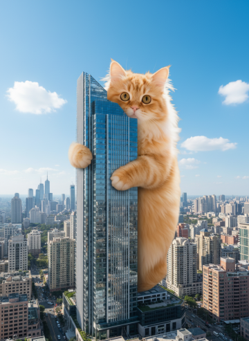 上传图中的猫咪主体,化身为现代城市中正在建设的巨型艺术雕塑装置。该巨型人物周围环绕着大面积脚手架,背景是澄澈蓝天与细节丰富的城市景观(包含街道、建筑、车辆,以及底座周围的渺小人群),整体画面超细节呈现,兼具真实纹理质感与超现实巨型艺术品美学风格。