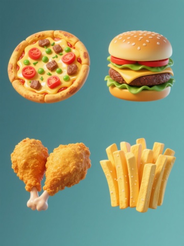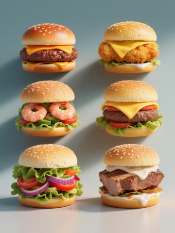 6个不同口味汉堡的系列集合,采用高写实主义3D渲染风格,每个汉堡都具有超细腻的食物质感和光泽,纯色背景,整体色彩根据不同口味调整:牛肉堡呈现焦香的棕红色牛肉饼与橙黄色芝士的经典搭配,鸡排堡为金黄酥脆的炸鸡排配亮黄色芝士,芝士堡突出多层融化的黄白色芝士与牛肉的棕褐色,虾排堡展现鲜嫩的粉红色虾排与青绿色蔬菜,蔬菜堡以丰富的绿色生菜、红色番茄、紫色洋葱等多彩蔬菜为主色调,羊排堡则是浅棕色的嫩煎羊排搭配白色酱料,所有汉堡均保持带芝麻的金黄色圆形面包顶底,内部夹有新鲜生菜、番茄片、洋葱圈等统一元素,规整地排列成两行三列,每个汉堡间距均匀,画面干净整洁,光线从斜上方照射形成自然阴影,凸显食物的立体感和美味度。