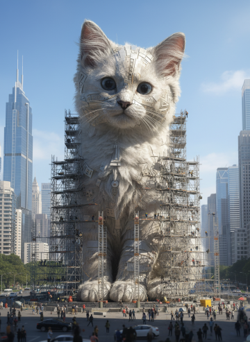 在现代化高楼林立的城市里,主体一只巨大的橘猫抱着一栋大厦,橘猫的身体与大厦一样大,巨物感,超现实主义,蓝天白云