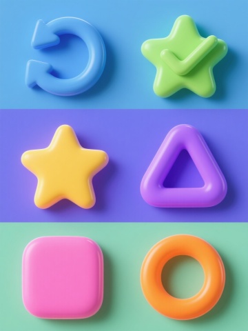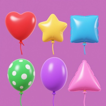 系列素材集合,规整排布在纯色背景上,保持简约现代的卡通插画风格,六个完全不同的节日庆典元素,每个元素都采用圆润的线条、鲜明的色彩对比和渐变过渡,具有轻微的立体感和光泽感,元素包括:1. 橙色和粉色条纹的派对帽,帽口飞出彩色卷曲彩带和圆点;2. 蓝色和紫色渐变的气球束,系着黄色丝带,气球上有白色高光;3. 红色和黄色的纸杯蛋糕,顶部有白色奶油和彩色糖屑;4. 绿色和蓝色的礼物盒,系着粉色蝴蝶结,盒盖微微打开,露出金色光芒;5. 紫色和粉色的生日蜡烛,蜡烛上有黄色火焰,周围有白色光点;6. 黄色和橙色的烟花,呈放射状绽放,有红色、蓝色和紫色的火花,所有元素大小一致,间距均匀,整体视觉风格统一。