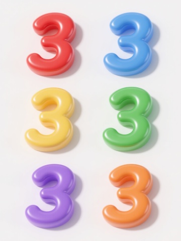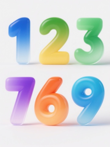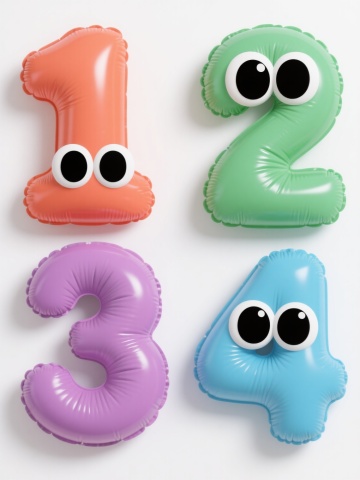 一组4个不同配色规整排布的3D立体数字素材,每个数字都采用膨胀效果的艺术字设计,字体圆润饱满,具有光滑且有光泽的充气塑料材质感,表面清晰呈现充气后的自然褶皱,立体感强烈,所有数字分别为“1”、“2”、“3”、“4”,每个数字都搭配一对黑色圆形大眼睛,背景为纯白色。