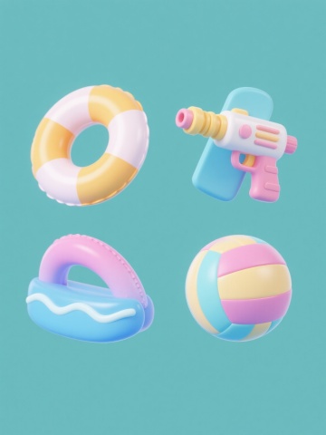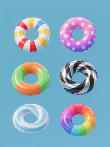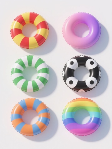 六个造型各异的充气游泳圈系列素材集合,每个游泳圈保持3D写实风格、光滑PVC材质质感、饱满充气形态和白色纯色背景,分别采用不同的色彩搭配(如红黄相间、绿白条纹、粉紫渐变、橙蓝撞色、黑白波点、彩虹渐变色),保持圆形主体和充气边缘细节,通过条纹方向、颜色组合、图案样式(条纹、波点、渐变)形成差异化造型,整体呈规整网格排布,光影统一为柔和顶光,高光和阴影过渡自然,确保每个游泳圈细节清晰且风格统一,画面信息传达简洁直观。