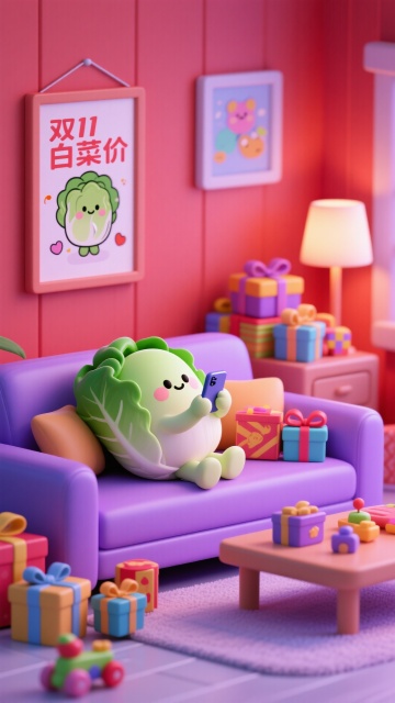 软3D风格的拟人化白菜角色坐在紫色沙发上刷手机,周围堆满礼物盒,墙上挂着“双11白菜价”海报,整体充满可爱、卡通、喜庆与温馨的节日氛围。
