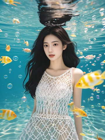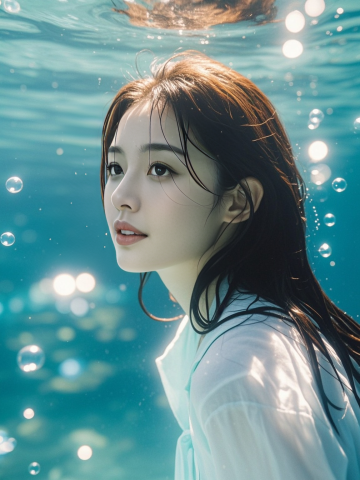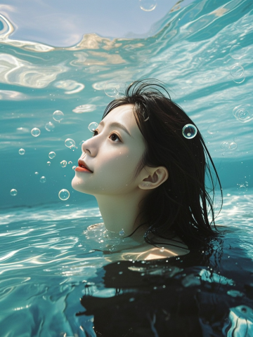梦幻液态风,清透光影中,少女轻盈浮游,唯美感与浪漫感交织。