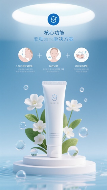 美妆产品宣传海报,整体采用清新通透的蓝白渐变色调,柔和的顶部光源营造出水润光泽感,3D立体展示的白色软管状护肤品置于圆形白色平台上,周围点缀白色花朵和绿色叶片,画面上方有产品核心功效的蓝色圆形图标与文字说明,中部包含分点介绍的肌肤问题示意图与解决方案,下方通过水滴、透明气泡等元素展现产品水润质地,搭配清晰易读的无衬线字体,整体排版层次分明,信息传达高效,符合护肤品针对敏感肌、追求温和清洁与保湿人群的宣传目的,保持相同设计风格与视觉元素,替换展示不同护肤品。