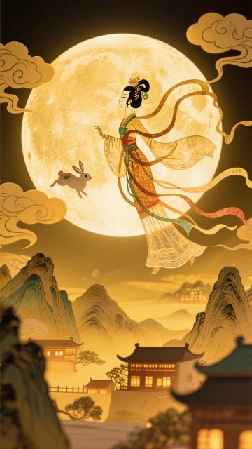 梦幻唯美的国潮插画风,工笔细腻勾勒嫦娥怀抱玉兔,彩带飘逸,鎏金线条点缀山川云纹,中式古典与民族美学交融,月华映照,尽显中秋浪漫。