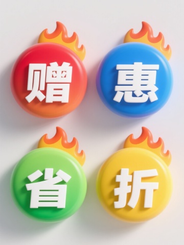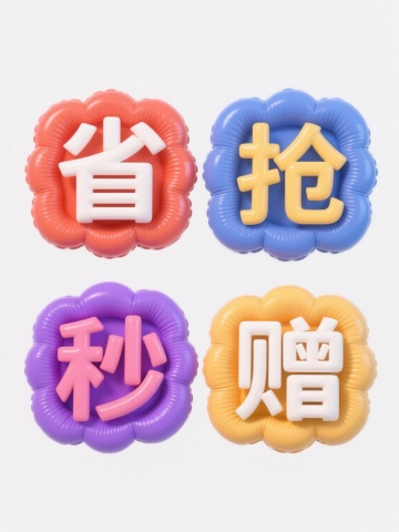 3D立体风格,一组4个不同配色规整排布的素材,膨胀效果的艺术字,字体圆润饱满,材质光滑且有光泽,保留充气后的褶皱,呈现出充气后的立体感,纯白色背景,文案“省”、“抢”、“秒”、“赠”,每个文字都有独立的彩色充气对话框背景,光影柔和,高光表现明显,色彩鲜明和谐,视觉层级清晰,信息传达高效,具有促销活动宣传的设计感。