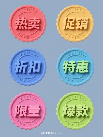 纯色背景,保持圆形印章式设计风格,6个不同元素内容的系列素材规整排布。每个印章采用不同整体色彩,包含"热卖"、"促销"、"折扣"、"特惠"、"限量"、"爆款"文字,中文采用立体艺术字设计,英文环绕排列,保持印章的立体感和正式感,整体设计简洁明了,信息传达高效,适合商业宣传使用。