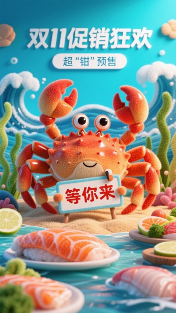 以卡通帝王蟹形象为核心,搭配生鲜美食,带有红包、优惠券、金币等促销元素,墙上有文字“超“钳”预售”,下面有设计感小字“双11促销狂欢”,以红色色调为主的双11促销氛围