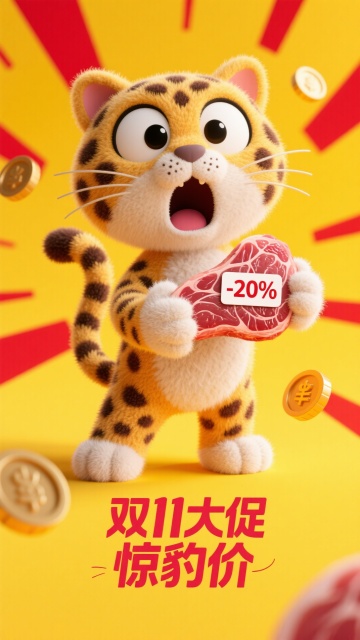 软3D风卡通人物推满礼盒的购物车,穿梭于金光四溢的超市隧道,结合波普艺术与粒子飞舞效果,营造11.11秋冬狂欢的双十一喜庆促销氛围。