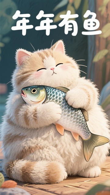 插画,可爱猫咪怀抱大鱼,拟人表情,年年有鱼,节日喜庆。