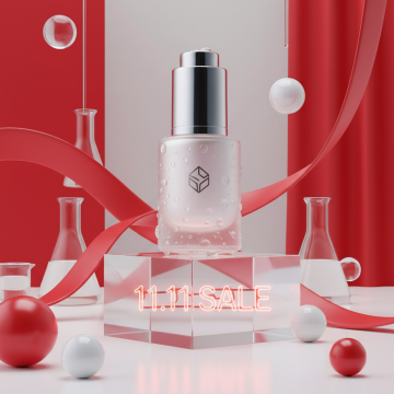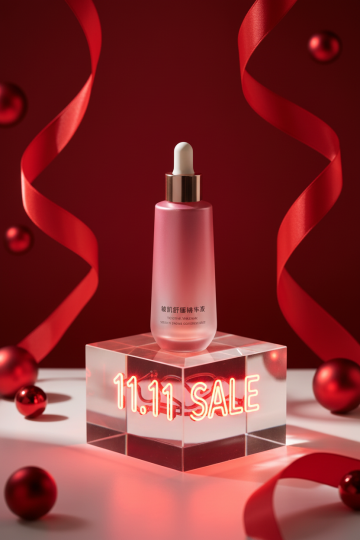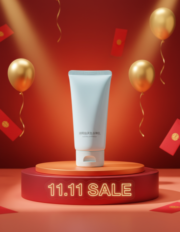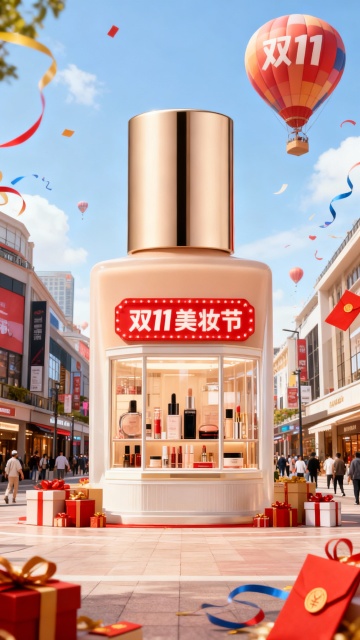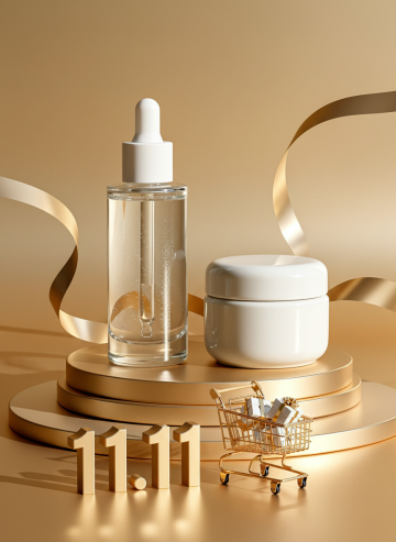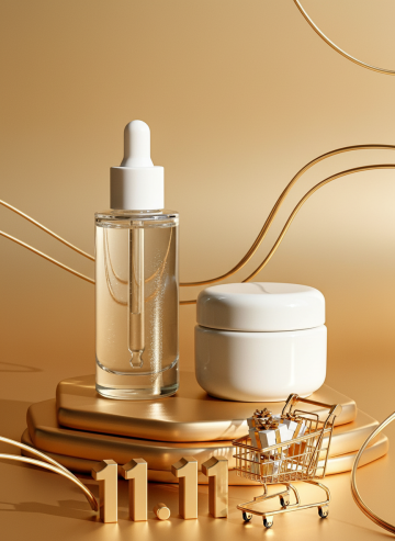 鎏金风与3D微缩艺术结合,金属质感线条勾勒现代奢华,购物车与“11.11”字样呼应双十一大促,科技感光影烘托高端护肤美学。
