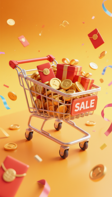 3D重拟物风格,塑料质感红袋盛满金币、红包与购物车,鎏金点缀,喜庆热烈,营造购物狂欢节促销氛围。