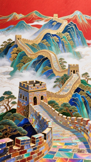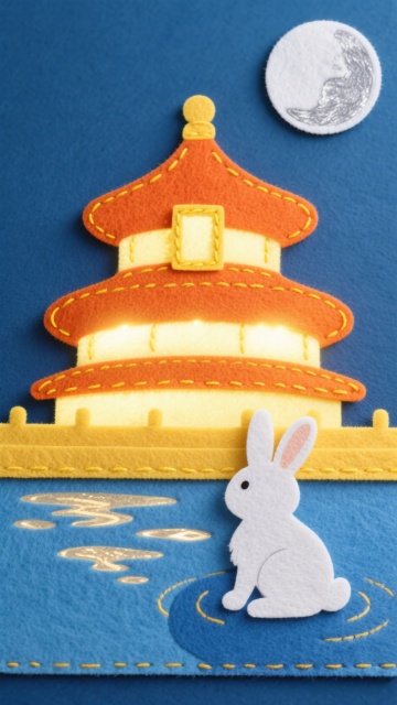 刺绣风工笔画,重拟物浮雕感呈现长城与明月,中式古典意境中融入梦幻唯美感,玉兔与楼阁共映,中秋佳节氛围浓厚。