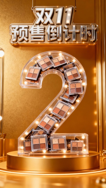 以暖棕、橙红为秋日主色调,场景设定为林间木屋展示区,中央是带原木纹理的透明立方体展台,展台下方点缀 “11.11 秋日购” 暖光木质灯牌,美妆商品放于展台内,背景搭配飘落枫叶、木质置物架、干花陶罐,营造温暖质朴的秋日美妆促销氛围。