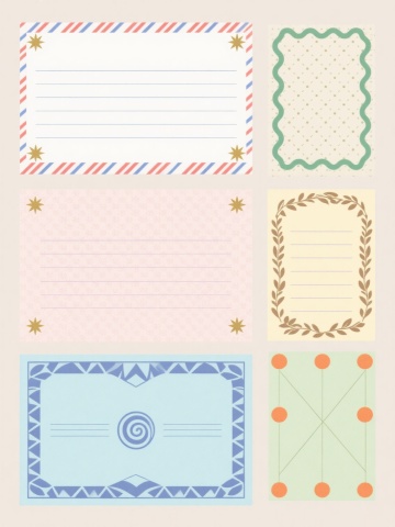 六张不同配色的信纸,每张具有独特样式花纹和材质,统一为浅色背景,上下两行对齐排列。第一张:白色纸张,顶部和底部有红蓝相间的斜条纹边框,内部是水平蓝色线条。第二张:米色纸张,四周为绿色波浪形花纹,中间是点状网格图案。第三张:浅粉色纸张,四角有金色星形装饰,背景是细小花纹,横线为淡紫色。第四张:淡黄色纸张,边缘是棕色树叶图案,内部为虚线分隔的横线。第五张:浅蓝色纸张,边框为深蓝色几何图形,中间是螺旋状花纹和水平线条。第六张:浅绿色纸张,顶部和底部有橙色圆形图案,内部是交叉线条形成的网格。所有信纸保持相同的矩形形状和大小,整体布局整齐有序,色彩搭配协调,具有清晰的视觉层次和统一的设计感。