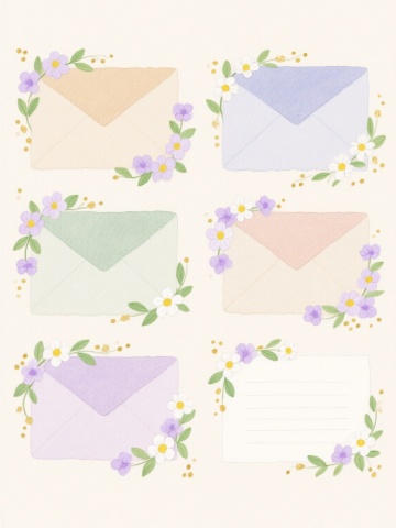 水彩风格的浅色背景,上面有六个不同配色、不同样式、不同材质的信纸造型,上下两行对齐排列。信纸边缘装饰着淡紫色和白色的小花,花蕊为黄色,还有绿色的叶子和金色的小点作为点缀,整体呈现出清新自然、柔和雅致的氛围,具有手绘质感和细腻的笔触。