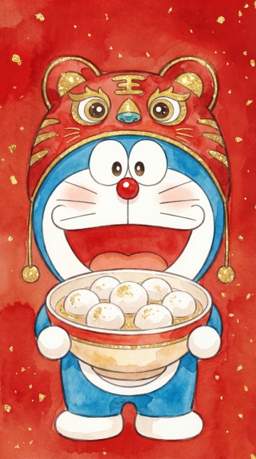 软3D毛绒质感的哆啦A梦手持巨无霸烧饼,金币纷飞,喜庆满溢,卡通风格萌趣十足,传递新年“心有烧烧,千千万”祝福。