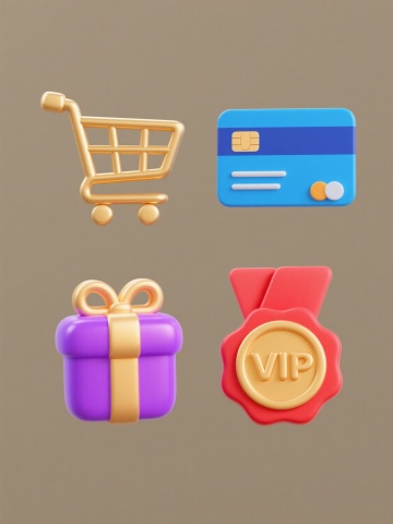 纯色背景上,四个具有相同软3D风格的图标呈规整排布,每个图标拥有独特的整体色彩,分别是闪耀的金色购物车、明亮的蓝色信用卡、炫目的紫色礼盒和鲜艳的红色奖章,所有图标均具有光滑的表面、圆润的边角、清晰的高光和柔和的阴影,保持与VIP字母相同的立体感和材质表现,整体设计简洁现代,视觉层次分明,信息传达高效。
