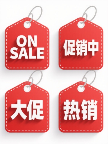 纯色背景上,同风格、同类目的6个完全不同元素内容的系列素材集合规整排布,每个素材均采用红色圆形印章设计,印章内有白色英文环绕和立体凸起的白色中文文字,分别为“新品推荐”“热卖爆款”“限时促销”“特惠折扣”“买一送一”“新品上市”,整体保持数字艺术的平滑过渡质感和清晰的视觉层级,确保信息传达效率。