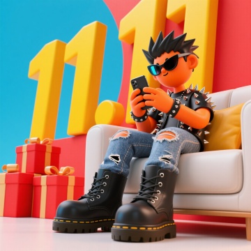 3D重拟物风格的充气数字“11.11”悬浮于空中,搭配金属质感红包与金币,营造出喜庆热烈的双十一大促氛围。