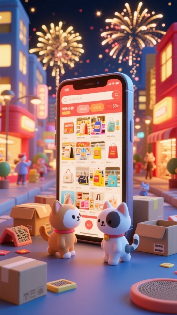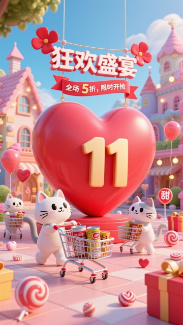 软3D风格萌猫推购物车,拟人化设计满载促销商品,商场飘舞彩带与折扣券,营造可爱、卡通、喜庆的节日促销氛围。