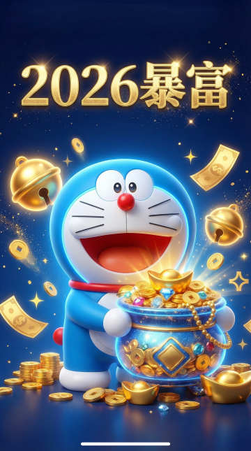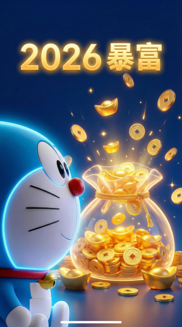 软3D毛绒质感的哆啦A梦手持巨无霸烧饼,金币纷飞,喜庆满溢,卡通风格萌趣十足,传递新年“心有烧烧,千千万”祝福。