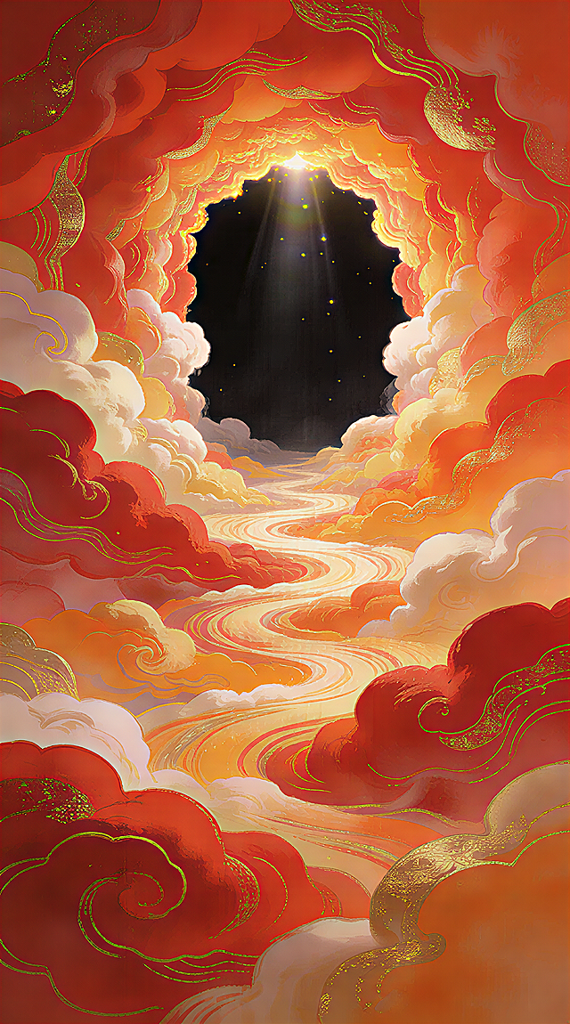 **大师之作,中国风奇幻插画,叶露盈、倪传婧风格**,传统神话与现代构图融合,描绘通往天界的超现实入口。 **核心构图:** 巨大的喜庆色螺旋云朵,由近及远盘旋而上,在画面上方中央形成一个通向纯黑背景的深邃云洞。 **视觉细节:** 云朵蓬松柔软如锦缎,呈现**朱红、鎏金与暖橘色**的瑰丽渐变。一道神圣柔和的顶光从云洞洒下,在云层边缘形成**璀璨的丁达尔光晕**。 **氛围与质量:** 整体为**喜庆热烈**的色调,充满希望与庆典感,画面**空灵神圣**。超高细节,8K分辨率,艺术站流行趋势。详情