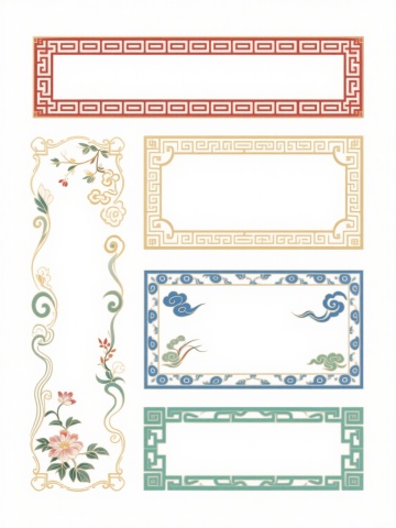 白色背景上的中式边框设计,边框采用不同配色和样式,包括传统回纹图案、祥云纹样、花鸟图案等,线条流畅细腻,色彩丰富多样,既有红色、金色等传统色调,也有蓝色、绿色等创新配色,整体呈现出典雅庄重又不失灵动的东方美学风格,适合用于中式装饰、传统节日、文化宣传等场景的边框素材。