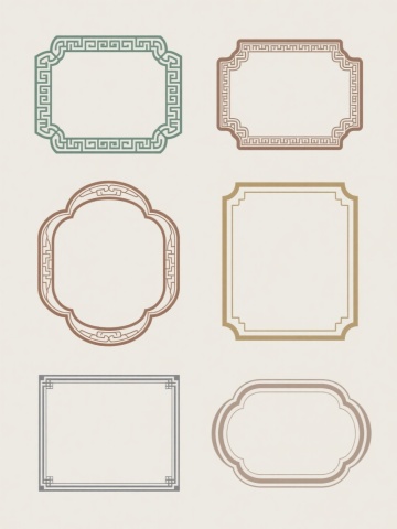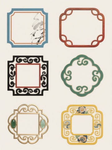 六个完全不同配色、样式与材质的中式边框造型,以浅色为背景,上下两行对齐排列。边框设计融合传统中式元素,包括云纹、回纹、如意纹等经典纹样,造型涵盖方正、圆角、弧形等多种轮廓。配色采用青蓝、赭石、墨黑、朱砂、翠绿、明黄等传统色彩,材质分别呈现水墨笔触的轻盈飘逸、木质雕刻的温润纹理、金属铸造的光泽质感、玉石镶嵌的通透温润、陶瓷烧制的古朴厚重以及刺绣工艺的细腻肌理。整体风格简洁雅致,线条流畅,细节丰富,展现中式美学的韵味与多样性,适合作为装饰性框架使用。
